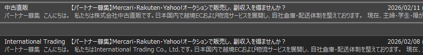 パートナー募集!? なりすましメール 迷惑メール 2026.02.11 このようなメールが届くようになった、 ■送信者タイトルは異なるが中身はほぼ同じ! ■SPFはpassしており、正常メールとしての扱い よく見ると、送信者と受信者が同じ、なりすましメールです。 対策としては送信者と受信者が同じものは「迷惑メール」扱いとしてルールフォルダ振り分けが当面よいと思われます。 中身は副業募集、いわゆるサイドビジネス!ひっかかりやすいが会社名を実在するもの掲載していたりしているので、ご注意ください。